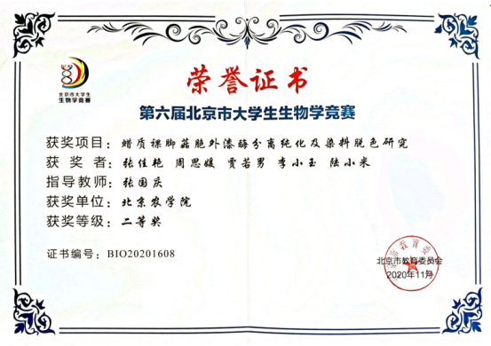 “北京市大学生生物学实验设计竞赛”中,我校共报送三项作品,其中植物科学技术学院张国庆老师指导的“蜡质裸脚菇胞外漆酶分离纯化及染料脱色研究”,获得市级二等奖。