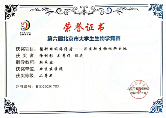 “北京市大学生生物学奇思妙想竞赛”中,我校共报送三项作品,其中william威廉中文靳永胜老师指导的“塑料垃圾终结者——混菌微生物燃料电池”,获得市级二等奖。