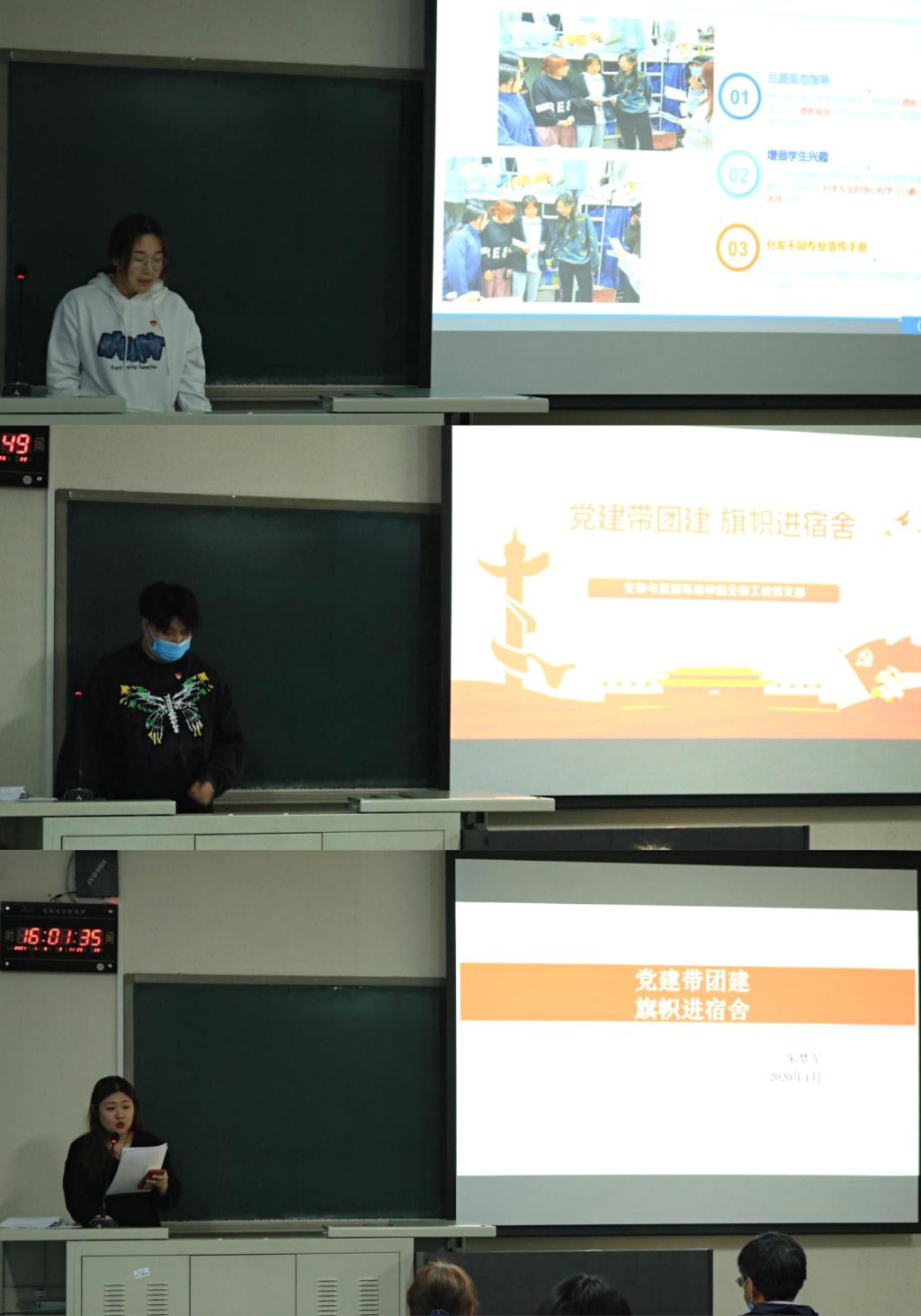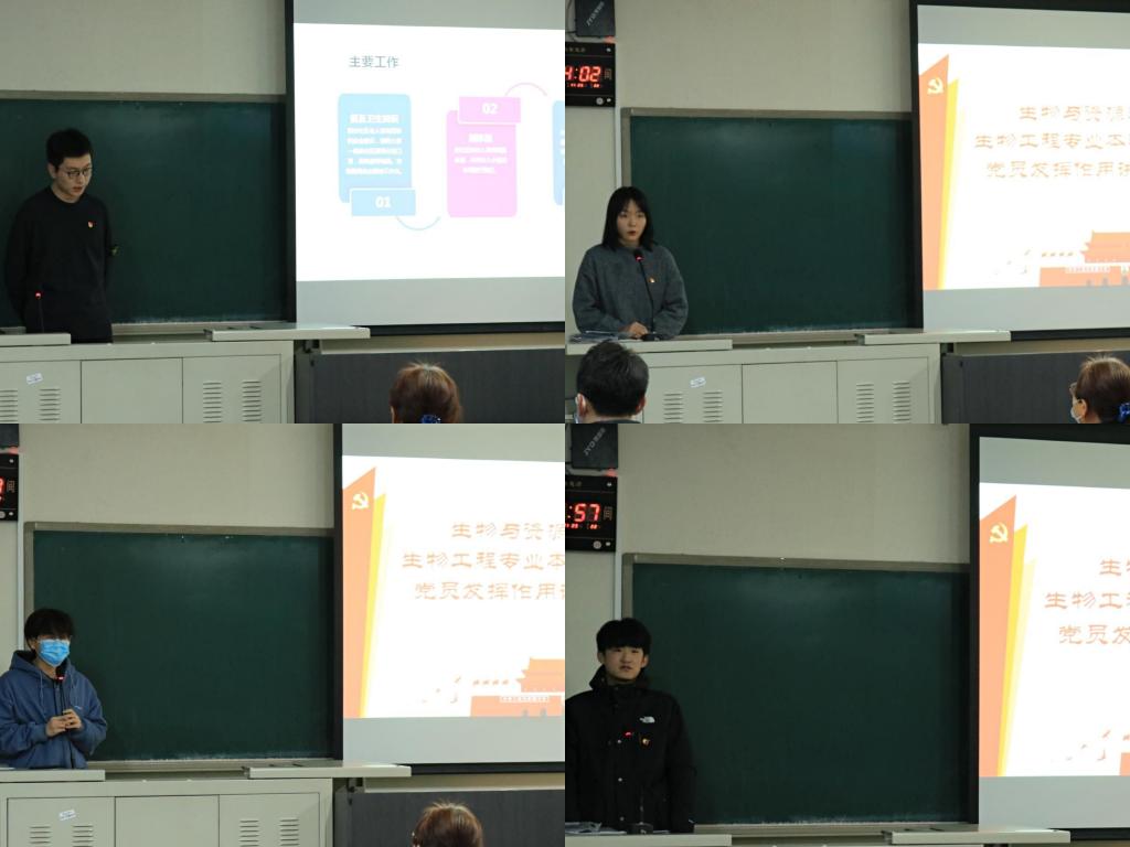预备党员全修治平介绍了他参加生物工程1班团日活动的情况,他用习近平总书记在国家公祭日的讲话对生物工程1班进行了思想指导工作,并指正了在参加团日活动过程种发现的一些问题;预备党员刘诗园结合自己的学习经验对生物工程专业的学生进行了朋辈指导,讲解了考试的重点题型。点评人生物工程2班班长甄磊就一学期以来,党支部积极为班级同学进行学业、生活以及思想素质的引领与指导表示感谢,并表明在今后的日子里积极向党组织学习,做好班级建设建设。