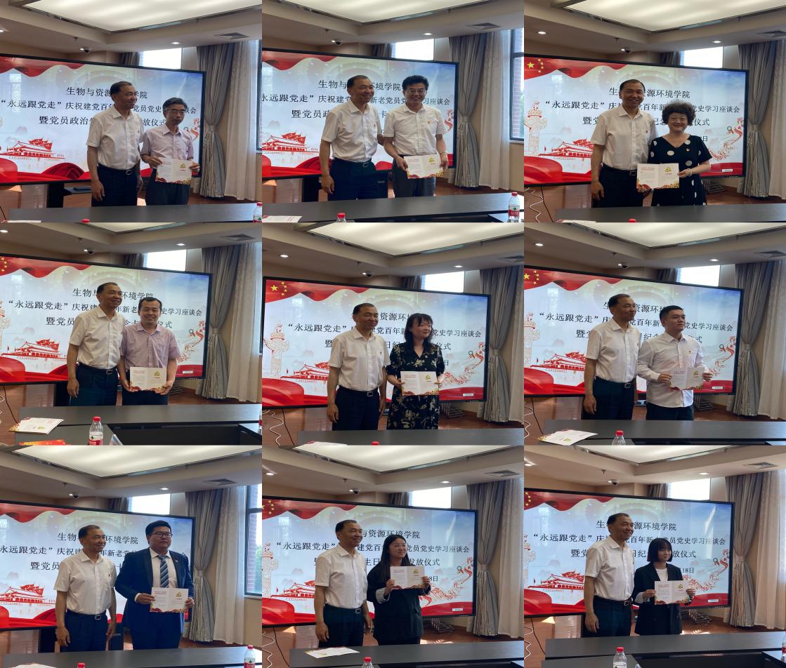 学校党委副书记仲丛生同志在讲话中亲切地与师生们分享了自己当年的入党经历,对生资学院组织新老党员座谈、为党员发放政治生日纪念卡、开展形式多样的党史学习教育活动等工作给予了充分肯定。仲书记说,习近平总书记在2021年春节团拜会上指出,“只要我们党始终站在时代潮流最前列、站在攻坚克难最前沿、站在最广大人民之中,就必将永远立于不败之地!”这“三个站在”深刻总结了我们党始终立于不败之地的政治逻辑,为全党在新征程上不忘初心、牢记使命、不懈奋斗注入强大思想和行动力量,为广大党员干部增添了动力,鼓足了干劲。恰逢建党百年,我们的党员师生要深刻领会“三个站在”内涵,立足本职岗位为国家发展新征程贡献新力量。仲书记强调,在党的领导下几代北农人不断向建设都市型现代农林大学的目标努力迈进,生资学院师生在这一过程中做出了积极贡献。回望过往的奋斗路,眺望前方的奋进路,党员师生们要谋划长远,抓住现在,团结一致,不断进取,为“北农梦”和“中国梦”的实现做出新的贡献。