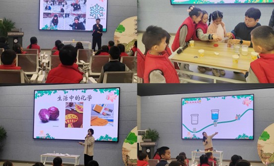 “酚酞变色”以一年级语文“天地人你我他”为内容,通过喷洒碱性溶液使字迹显现,孩子们在互动中了解了酸碱指示剂的奥秘。“硫酸铜玫瑰”展示了晶体在花瓣表面析出形成蓝色“水晶外衣”的过程,融自然之美于化学之奇。“人造雪”实验则从初雪话题引入,孩子们亲手制作彩色雪粉,并认识了吸水树脂在日化、农林等领域的应用。本次科普活动通过生动安全的实验设计,抽象的化学知识转化为可感可触的奇妙体验,有效激发了孩子们的科学兴趣与探索欲,在孩子们心中播下了热爱科学的种子。