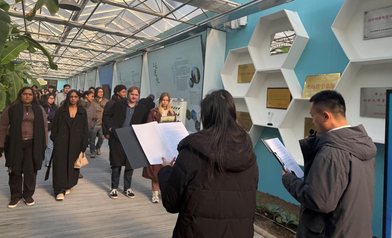 本次活动通过实地参观与现场讲解相结合的形式,向国际青年群体集中展示北京市都市型现代农业发展成果与智慧农业应用实践。活动在北京市朝阳区来广营乡的朝来农艺园连栋温室内举行。参观过程中,由朝来农艺园工作人员石子航和科技小院指导老师陈永攀担任中英文双语讲解,赵晓燕老师和高坦坦老师协同翻译与补充说明,围绕园区建设背景、设施农业技术和数字化管理模式,为留学生们系统介绍中国设施农业与智慧农业的发展路径。