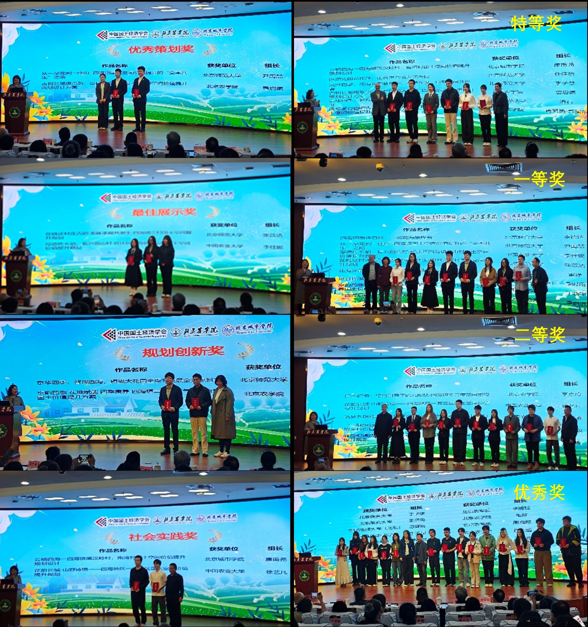随后,进入决赛的团队在各分会场进行了作品展示。各团队围绕乡村国土空间优化、生态价值提升、产业布局与文化传承等主题展开严谨答辩。经过专家评审组公平公正、严格细致的评议,大赛最终评选出特等奖6项、一等奖8项、二等奖10项,单项奖8名,充分展现了当代大学生扎实的专业功底与创新实践能力。其中,特等奖及一等奖总评成绩前两名参赛团队将代表北京赛区进军全国总决赛。在闭幕式与颁奖典礼上,与会嘉宾为获奖团队颁奖,现场气氛热烈。