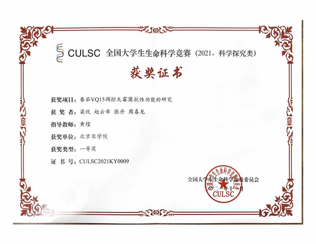 2021年全国大学生生命科学竞赛一等奖(番茄VQ15调控灰菌霉抗性功能的研究)