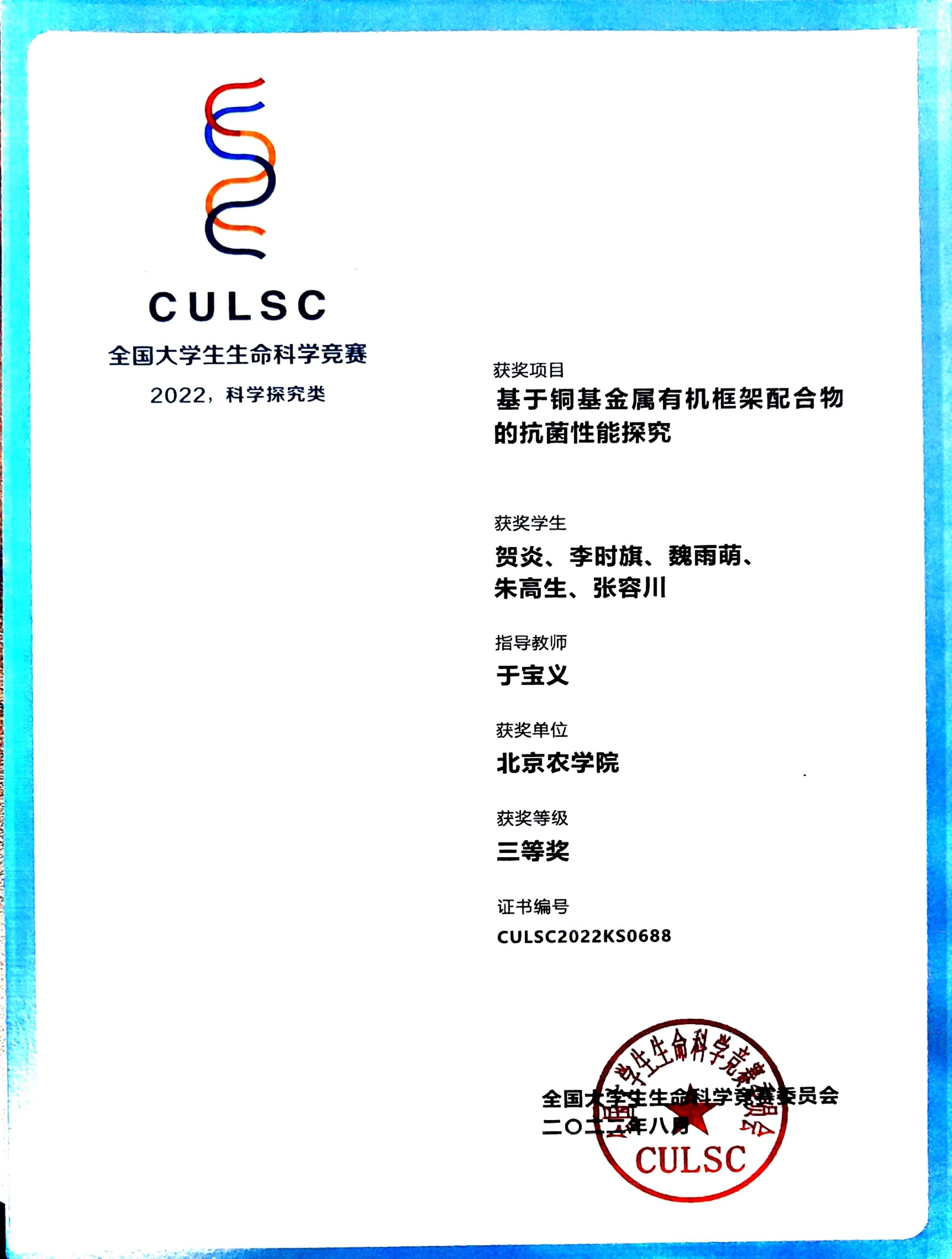 2022年生命科学竞赛三等奖(基于同基金属有机框架配合物的抗菌性能探究)