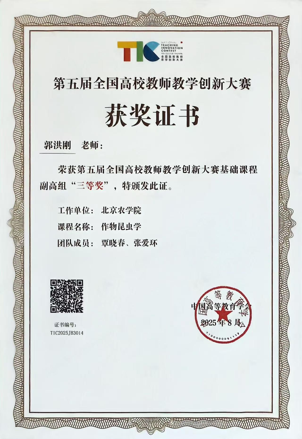8月19日,由教育部高等教育司指导,中国高等教育学会主办的第五届全国高校教师教学创新大赛总结大会在北京理工大学举行。生资学院植保系教师郭洪刚带领的《作物昆虫学》课程团队(成员:覃晓春、张爱环)荣获基础课程副高组三等奖。