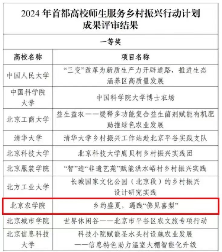 近期,市委教育工委、市教委组织专家对入选《2024年首都高校师生服务乡村振兴行动计划》的100支团队进行项目成果评审,我院《相约盛夏,遇践“佛见喜梨”》荣获一等奖,并成功入选“时代新人强国行”首都大学生主题社会实践优秀案例!