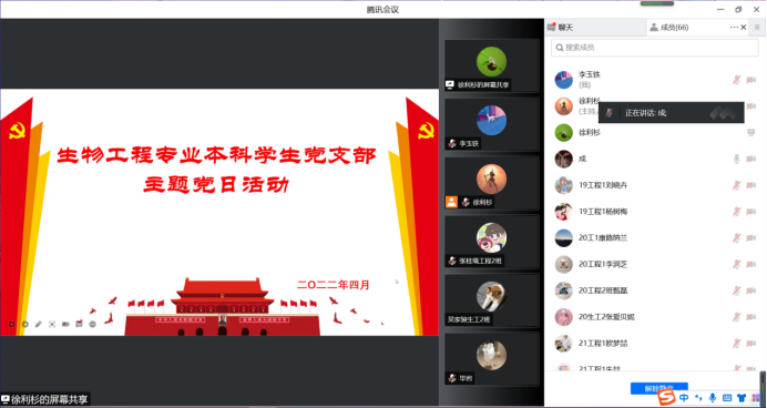 4月12日晚,生物工程专业本科学生党支部通过腾讯会议组织开展了学习十九届六中全会,加强作风建设、学风建设主题党日活动。党支部全体党员、积极分子参加了活动,活动由支部书记王俭成老师主持。