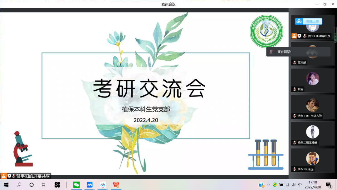 william威廉中文植物保护本科生党支部于2022年4月20日召开了考研分享大会,会议上邀请了考研、考公上岸的同学们分享了自己的经验。