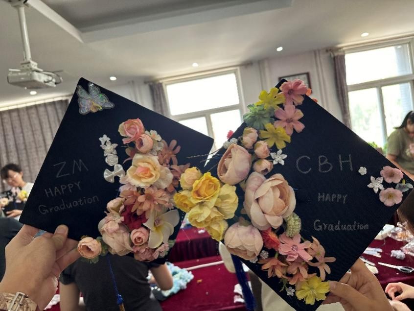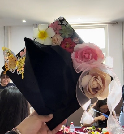 活动伊始,申维维老师给同学们介绍了簪花学位帽的制作方法,并结合所学专业知识让同学们了解到簪花活动对于促进心理健康的重要作用。随后,同学们以帽为“纸”,以花为“笔”,将朴素的学士帽点缀得五彩斑斓,一顶顶独一无二、“帽”美如花的学位帽展现在大家面前。