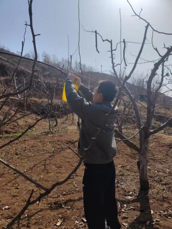 阳春三月,气温骤生,正是梨木虱越冬成虫出蛰的时候,科技小院团队分别对茅山后村老果园、中果园和幼果园的梨木虱发生情况进行了调查,发现梨木虱虫口密度在中果园中较大,团队及时组织果农进行打药防治和挂黄板物理防治。
