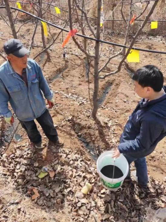 梨树的茁壮成长离不开施肥,当地特色的土壤和正确的施肥方式使得茅山后村的佛见喜梨有了自己独特的风味。任争光指导果农春季补施微生物菌肥,一方面促进秋施农家肥的分解,另一方面起到对梨树保根护根,防病促生的作用,村里目前超过2/3以上的农户开始使用微生物菌肥替代化肥。
