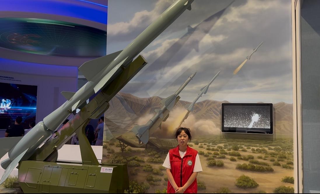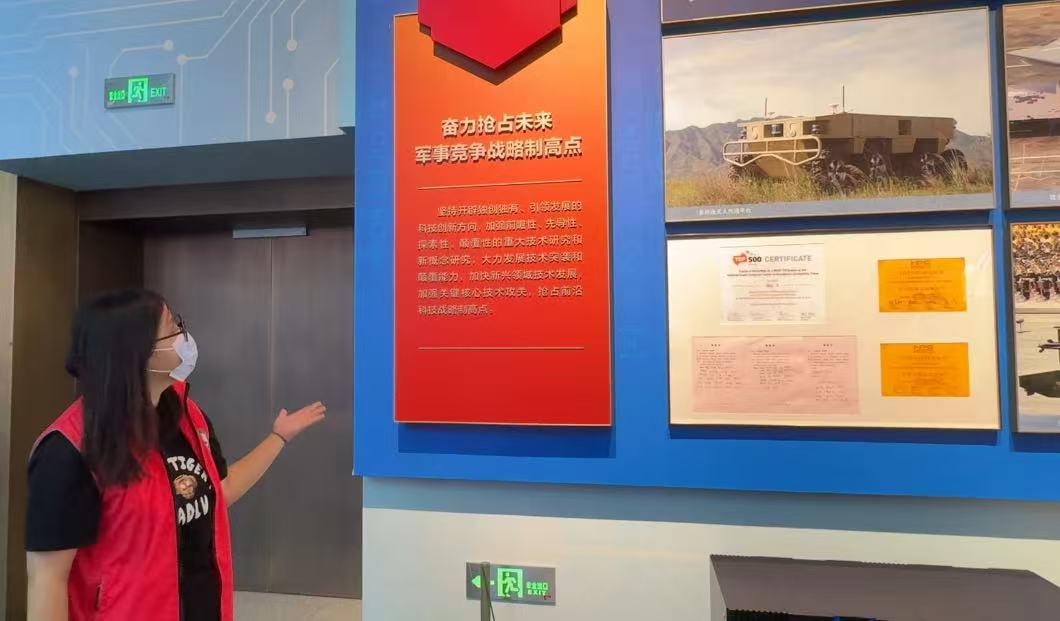 随后,来到了军事科技陈列展厅,宣讲员朱云淇同学先介绍了“中国制造的首枚实战导弹:红旗二号”意义非凡。1967年定型的它,是我国首款地空导弹,曾成功击落 U-2 侦察机,标志着我国防空导弹从仿制走向自研,筑牢长空屏障。接着介绍了,不远处的 “沙漠苍狼系列无人车”,由国防科大与民企联手打造,在挑战赛中展现卓越越野性能,是军民融合成果,预示军事作战模式新变革,为军事现代化注入活力。