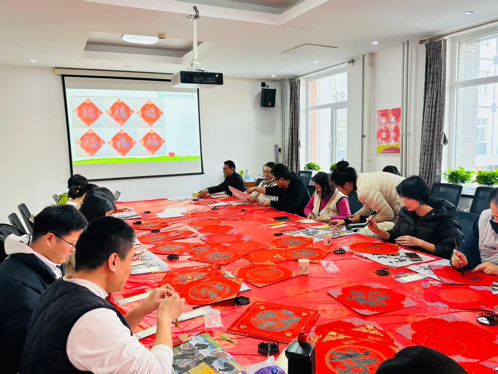 活动现场红纸铺展、墨香四溢。教师们暂别教学科研的忙碌,挥毫泼墨,各展才情。一纸“福”字,承载着对新年吉祥的深切祈愿;一副春联,寄托着对美好未来的殷切期盼;一枚书签,则留存了时光流转中的雅致意趣。大家或凝神构思,或潇洒运笔,在墨韵流转中传递温情,于方寸纸间凝聚祝福。