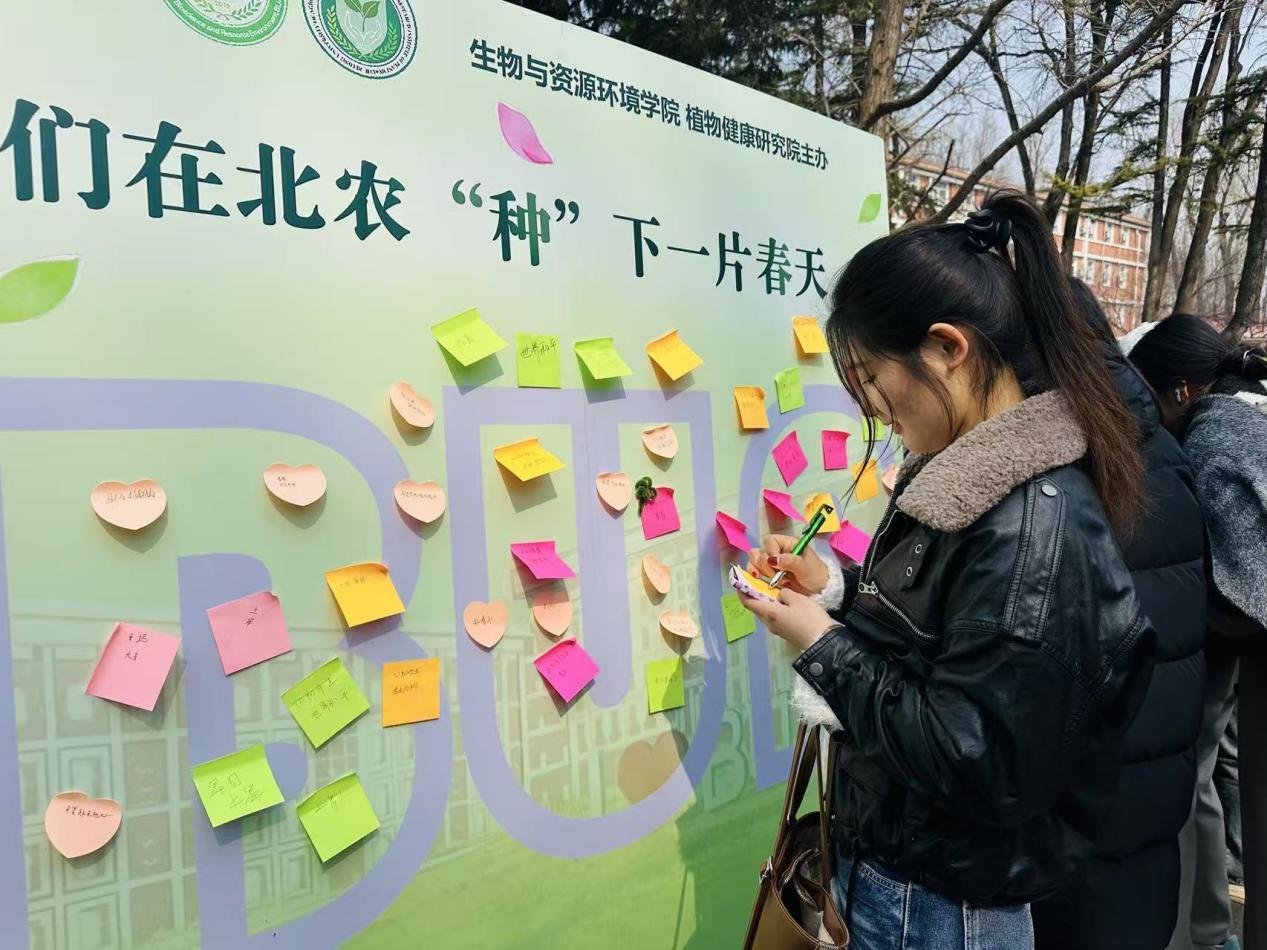 创意实践暖人心,春日美好定格在北农。“指尖生花,定格春日”环节温情满满,现场设置的花朵扭扭棒制作区,成为同学们发挥创意的天地。大家亲手制作出形态各异的创意花朵,在体验手工乐趣的同时,纷纷在便利贴上写下对学校的美好祝福、对绿色未来的无限憧憬。一张张写满心意的便利贴汇聚一堂,拼出醒目的“I love BUA”图案,将北农学子对校园的热爱、对生态美好未来的期盼,定格在这个充满生机的春日里。